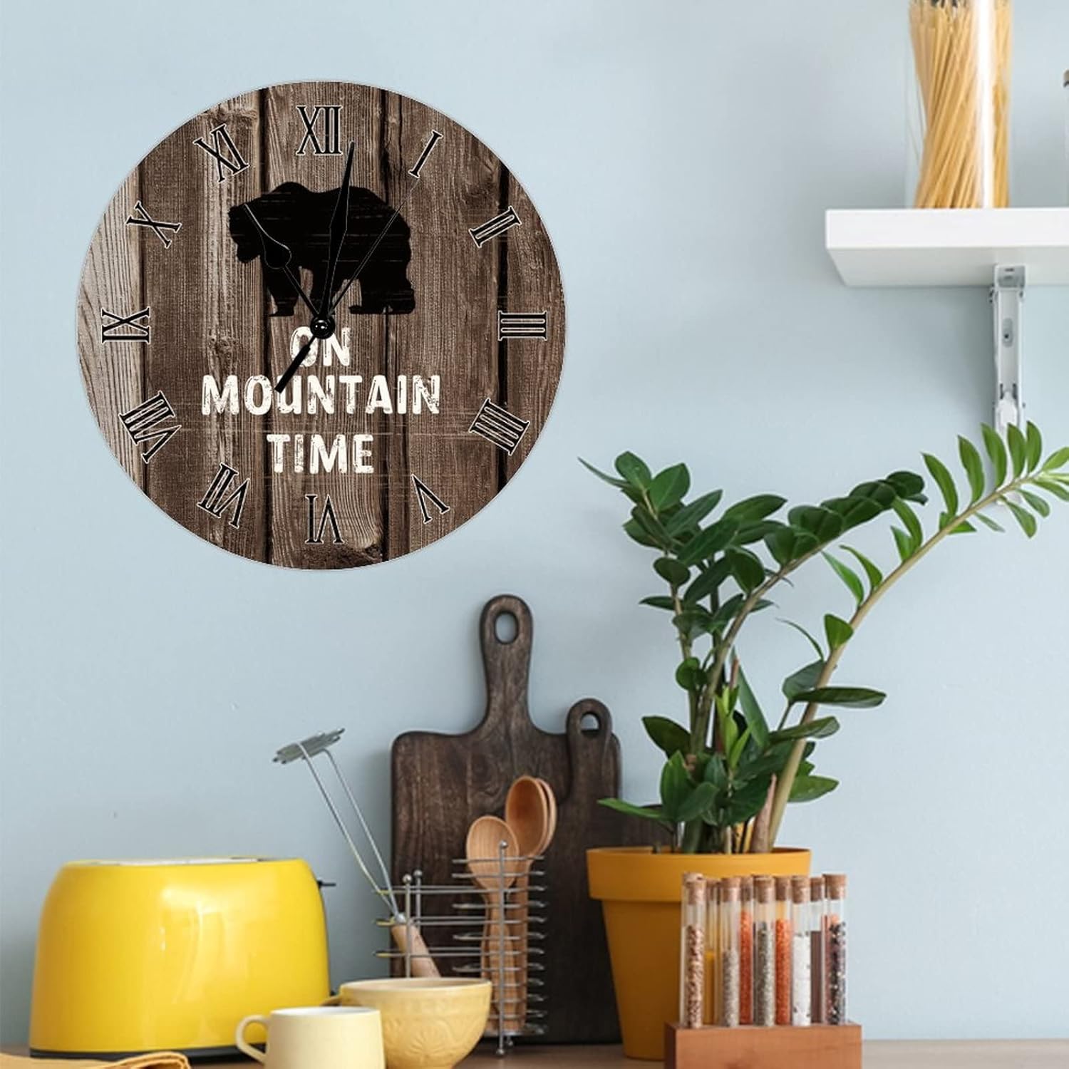 This wood art wall clock is well for a home with modern design, rustic country style and vintage decor. It's an absolute must for anywhere you call home. Add charm and an affirmation of positivity and gratitude into your home decor with this cute piece of hanging wall decor.PRODUCT DETAILS:- Size : 15 Inch.- Material : Wooden,1 x AA Battery (Not Included).- Design: The dial pattern is vintage bear, allowing people to get a sense of the time when they free.- Home Decor: Our wall clocks great for any room at home, work office or classroom. Such as your kitchen, living room, bedroom, family room, meeting room or dining room.- Quiet Enough: The clock is silent so you do not need to worry about the constant ticking of regular clocks when you need some peace to concentrate on your work or enjoy a full night of undisturbed sleep.- Easy To Read:Big and vintage Roman numerals indicate at every hour and minute tracker make it easy to see from any corner of your room.-Easy on Hang:There are hooks on the back of the clock,you can hang on any nail, screw or or small wall hook.-Keep Good Time: This clock add to its simplistic looks and provides you with accurate, perfect time. Keeping accurate time to each second making sure you are never late.- Gift Ideas: A perfect gift idea for your mom, dad, sister, brother, grandma, wife, husband, and all other beloved ones with many surprising designs. You can give it as a birthday, Christmas, New Year,Valentine's Day, anniversary, and housewarming present.