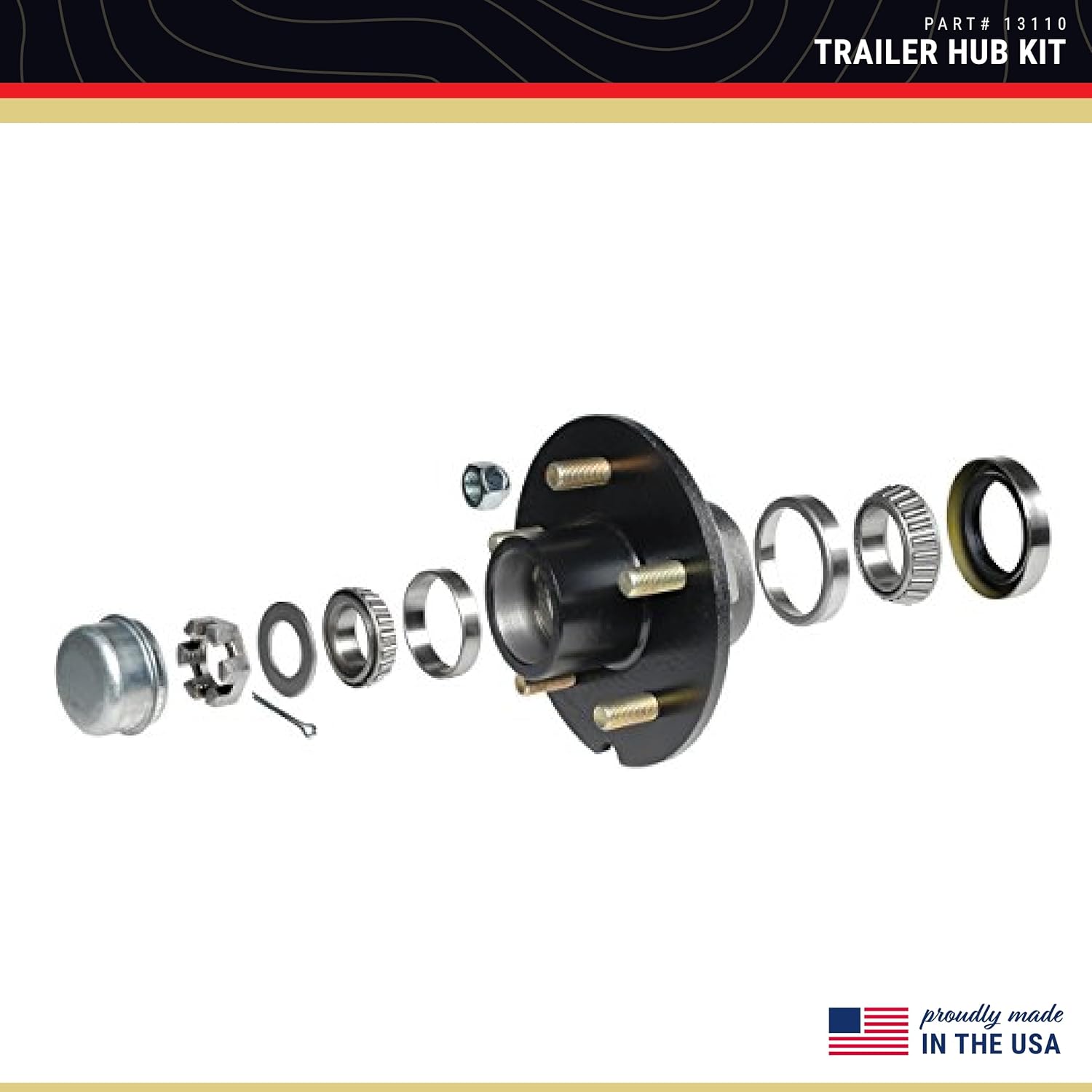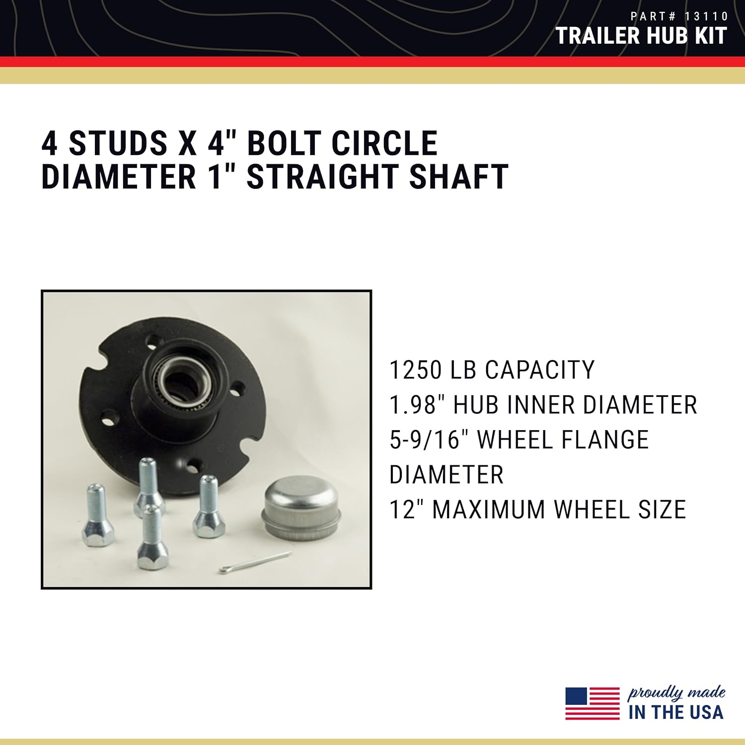 The CE Smith 13110 Trailer Hub Kit is the perfect choice for boat and fishing enthusiasts looking for a sturdy and easy-to-use hub for their boat trailers. Fully assembled and pre-greased, this hub kit is designed for easy installation onto your trailer's axle. With four studs and a 4" bolt circle diameter, it offers sturdy construction that can handle a capacity of 1250 pounds. The 1" straight shaft and 1250-pound capacity make it compatible with standard trailers. The 5-9/16" wheel flange diameter and 12" maximum wheel size make maintenance and replacement of parts easy. The 1.98" hub inner diameter ensures a perfect fit for your trailer axle and ensures durability and longevity for your trailer's use. In addition to its great features, the kit includes a convenient carry case, dust cap, cotter pin and lug nuts for easy transport.CE Smith was established as a manufacturing firm for metal stamping production, fabrication and assembly for a variety of industries. We are dedicated to providing high-quality products and efficient, responsive service to our customers. As a company, we are always challenging ourselves to reach a higher standard and introduce new, better products to provide customers with a full-line source and the best value in trailer parts and accessories. Under the Smith trademark, CE Smith manufactures and sells replacement parts for small to mid-size boat trailers including trailer fenders, boat guides, galvanized bracketry, tire carriers, replacement wheel bearings, rubber rollers, roller shafts, U-bolts and other requirements for boat trailers.We are committed to providing precision stampings, innovative products and excellent service to manufacturing and aftermarket accounts. Thanks to the confidence of our customers, we have grown to be a recognized name in the marine industry.