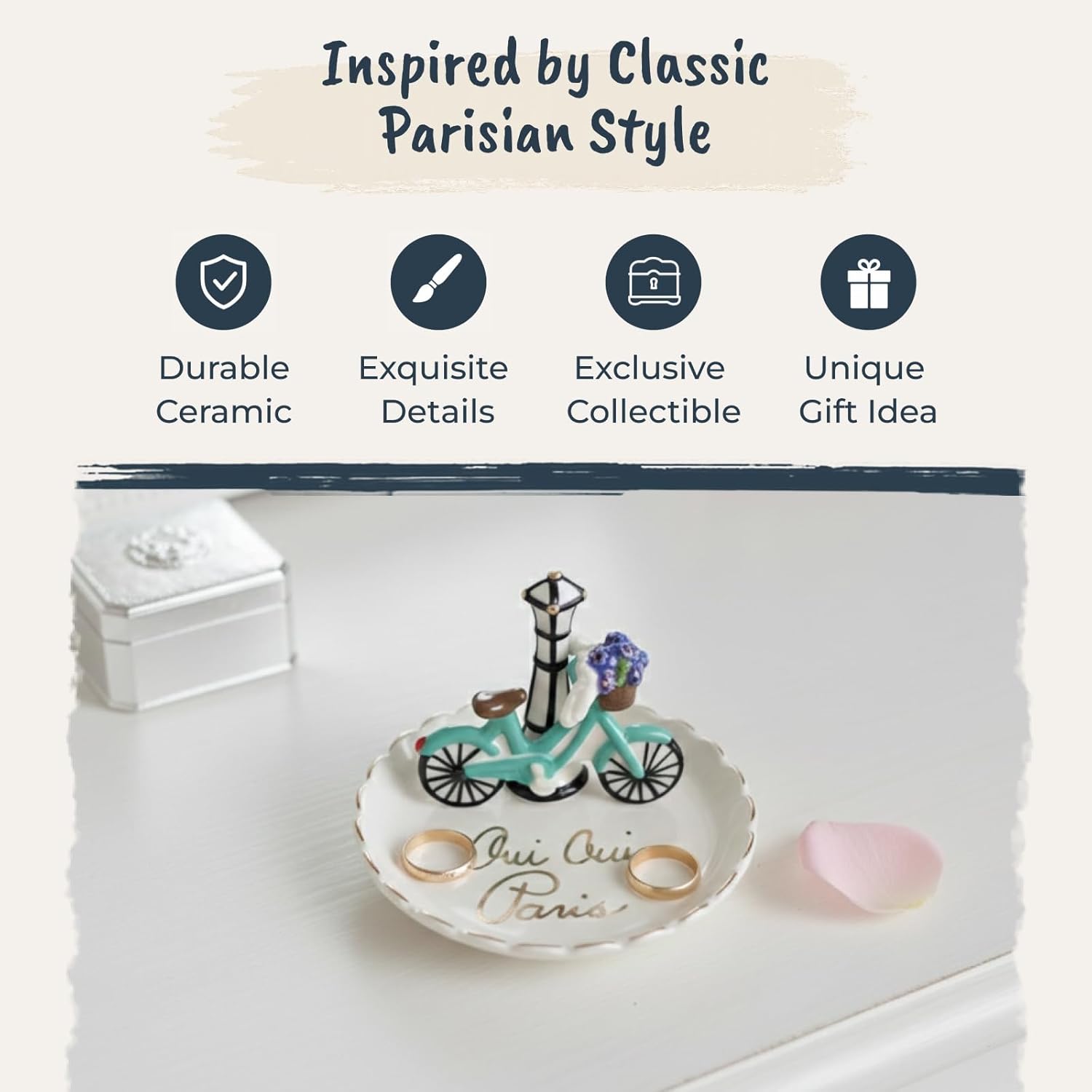 Blue Sky Ceramic oui oui Paris ring holder, measures 4.5 x 4.5 x 3 - Blue Sky Ceramic has been offering high design, trend-right ceramic designs for over 14 years. We design our own collections of trend-forward items as well as individual and exclusive products. These extraordinary designs are created by our large array of talented artists & in-house design team. Each unique piece is handcrafted with meticulous detail and the highest quality material.