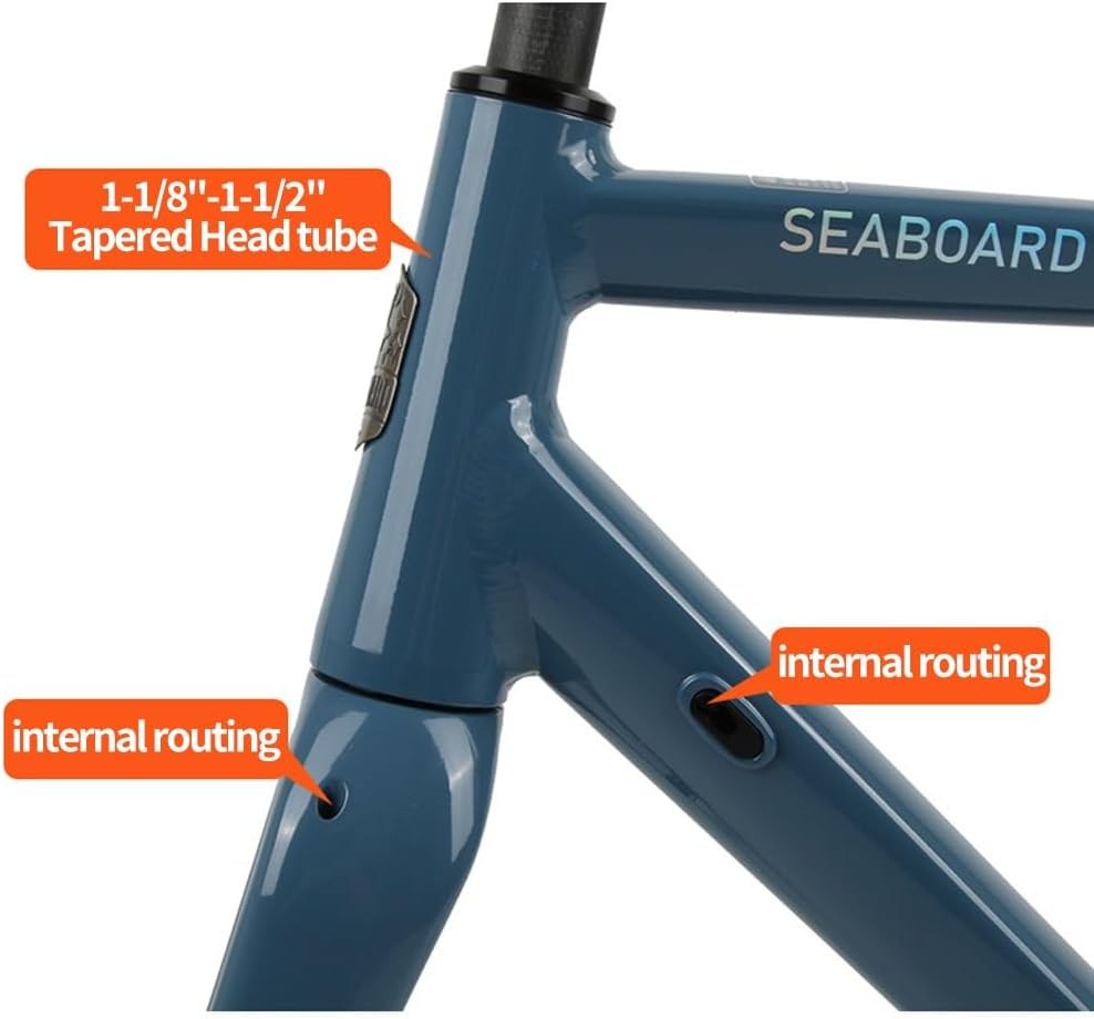 700C Gravel road bike frameset, 44cm/47cm/50cm/53cm/56cm Aluminum Alloy disc brake frame, Thru Axle frame F12*100mm R12*142mm, Perfect gift for bike lovers, can be assembled with your friends.Product name: Gravel road bike framesetFor wheel:700C wheels Frame higth:44cm/47cm/50cm/53cm/56cmRecommended rider height 145-160cm/160-170cm/170-180cm/180-185cm/185cm above.Aluminum Alloy Frame:Tire: 23-45CHead tube: 1-1/8''-1-1/2" TaperedHeadset: 41.8-52mm headsetSeatpost: 27.2mmSeatpost Clamp: 31.8mmBottom Brackets: BB68mm Threaded Bottom Bracket (Suitable for SHIM#ANO bottom bracket)Chainring: single chainringOpening: Thru Axle R12*142mmBrake: disc brake, 140mm disc brake rotor can be installed, 160mm rotor can be mounted by adding a disc brake mount.Weight: 1695±30g(50cm)Carbon Fibre ForkSteerer tube: 28.6mm Brake: disc brake, 160mm disc brake rotor can be installedOpening: Thru Axle R12*100mmTire: 23-45Cweight 485±10gFeatures: half internal routing, Support front and rear racks, fenders, three water bottle cage mounting position design.Color: Gray Blue , OrangePackage: Frame + carbon fibre fork + seatpost + headset + + thru axle lever×2 + seatpost clamp + tail hookNOTES: Please check if the bike frame size is correct before purchasing.Service: If you have any product and service questions, please contact us and we will respond to you within 24 hours.