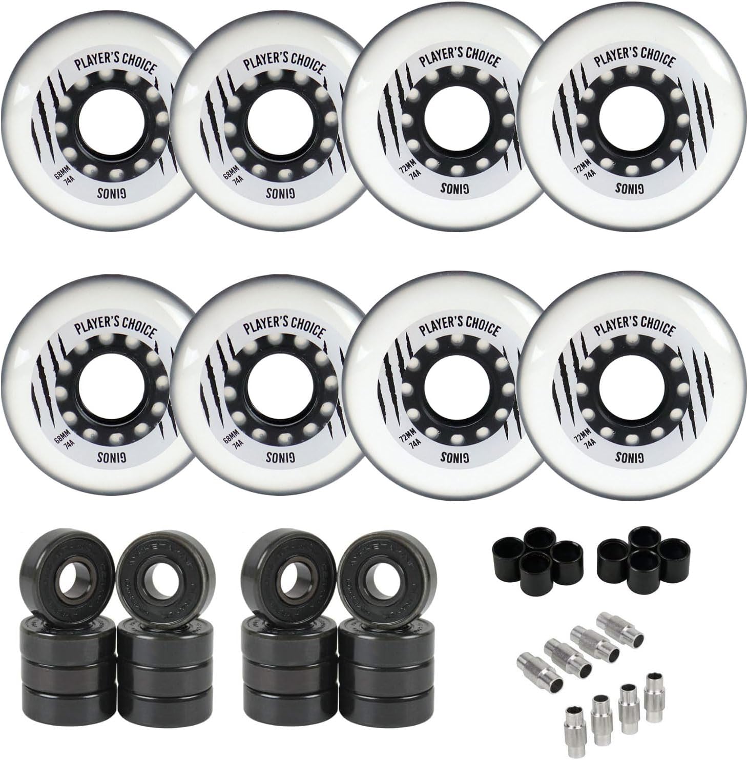 • Includes: 8 72mm Wheels, 16 Hybrid Ceramic Bearings, 8 8mm Floating Spacers, and 8 6mm Stepped Spacers (You only need 1 set of spacers depending on your skates, we inclue both as a courtesy). Please take the time to ensure the wheel specifications on your skates. Many manufacturers use different wheel configurations, but almost all use these 5 basic sizes: 59mm, 68mm, 72mm, 76mm, and 80mm. Measure your current wheels, or check your skate specs to ensure a smooth installation!