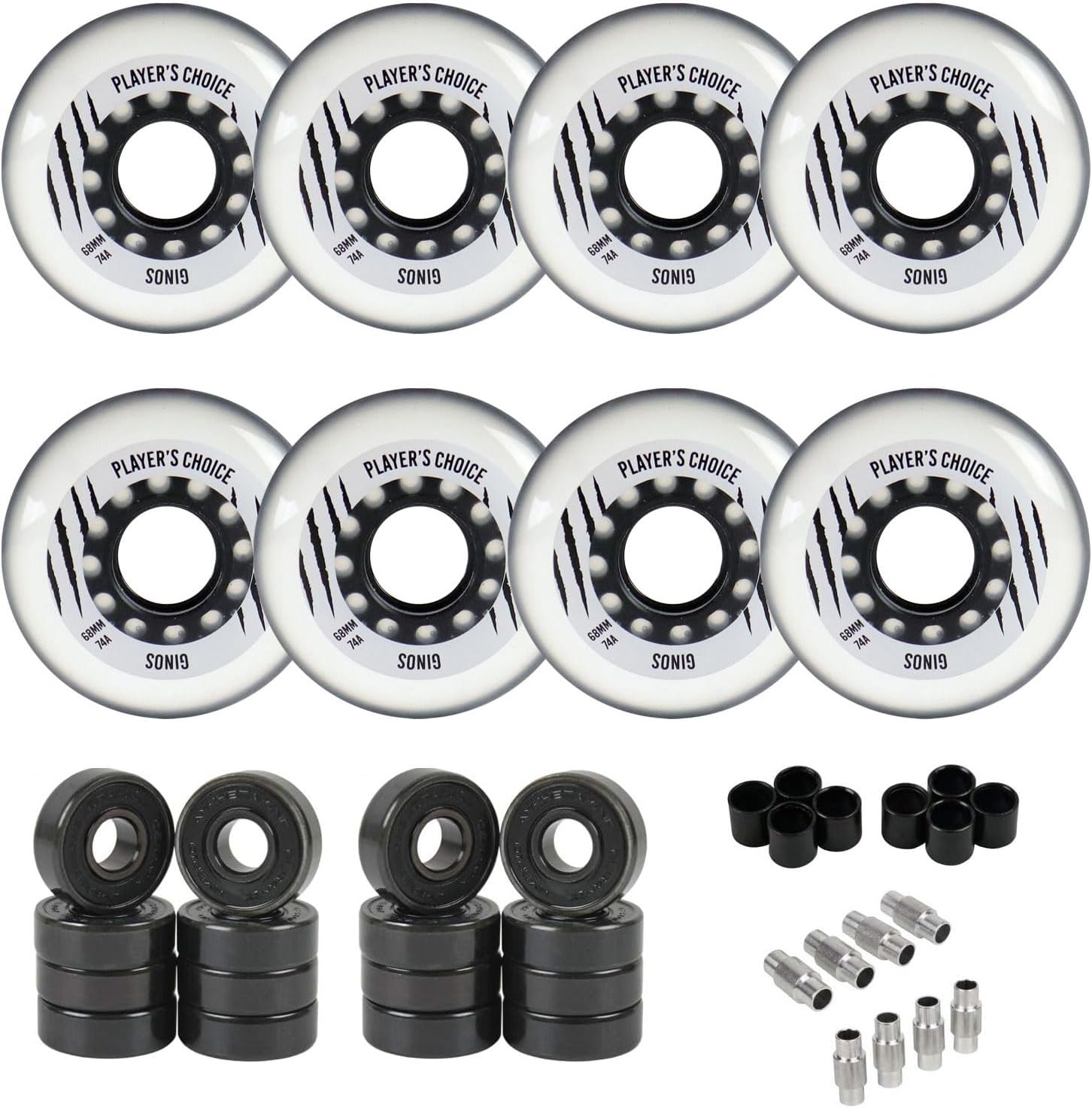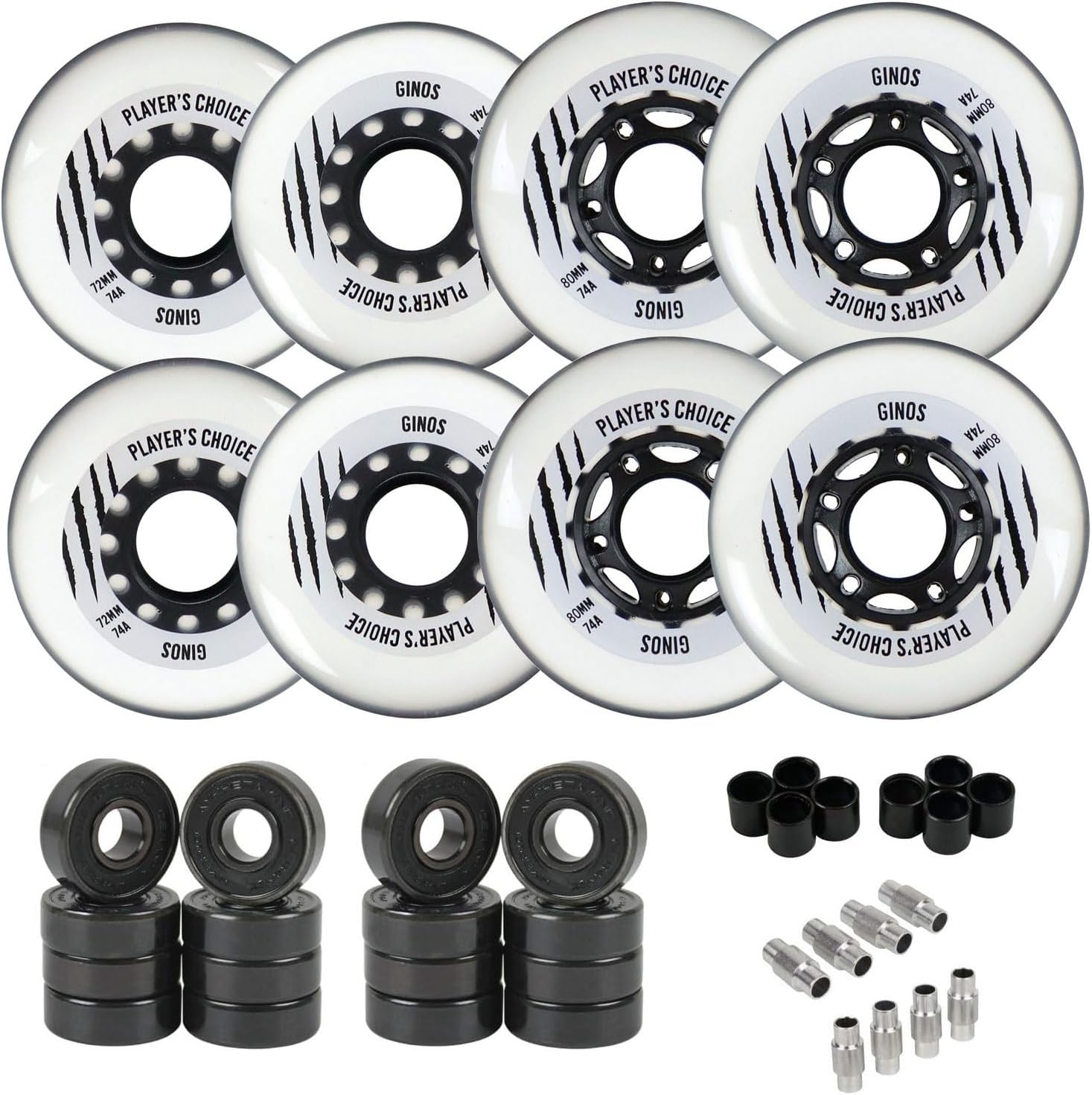 Player's Choice Indoor Roller Hockey Wheels 8-Pack with Hybrid Ceramic Bearings and Spacers - Ginos Clear Grey Dual-Pour 74A Hardness for Skates - Super High Rebound Urethane